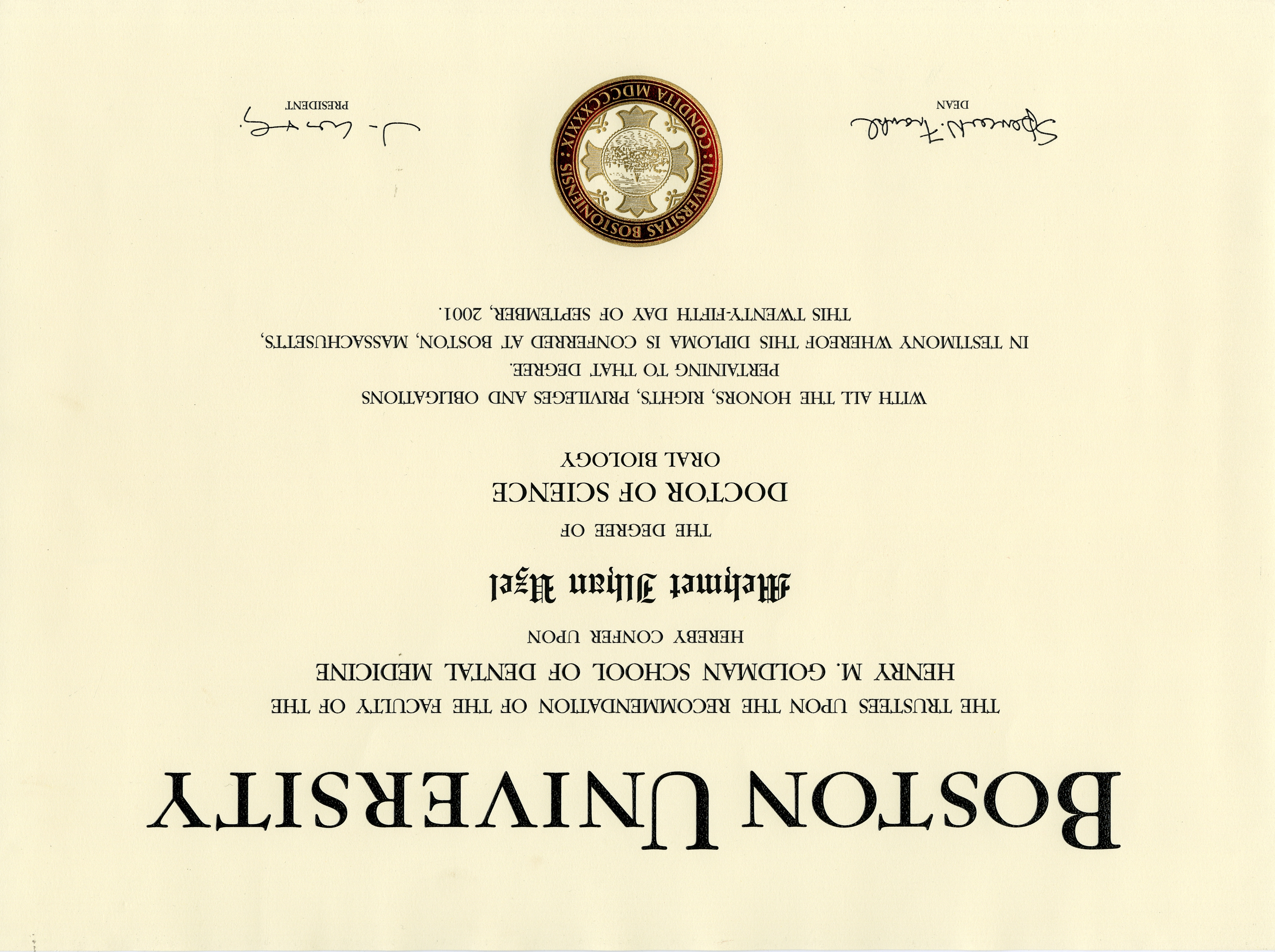 - 2001 - Doctor of Science in Oral Biology (D. Sc.), Boston University